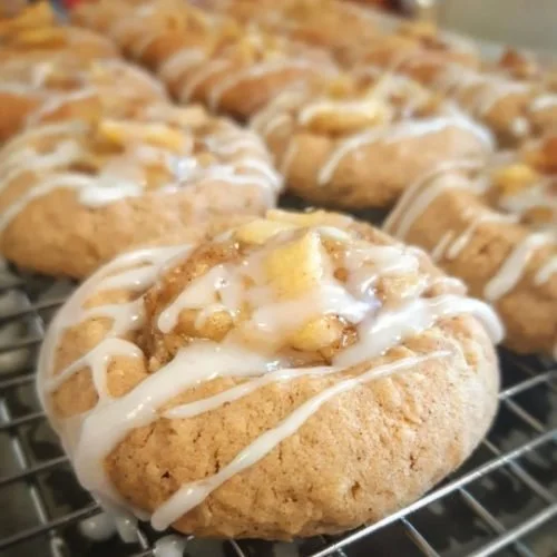 Cinnamon-spiced cookie with warm apple pieces and a drizzle of sweet vanilla glaze.