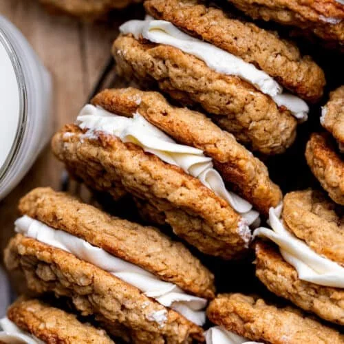 Chewy oatmeal cookies with fluffy vanilla cream inside.
